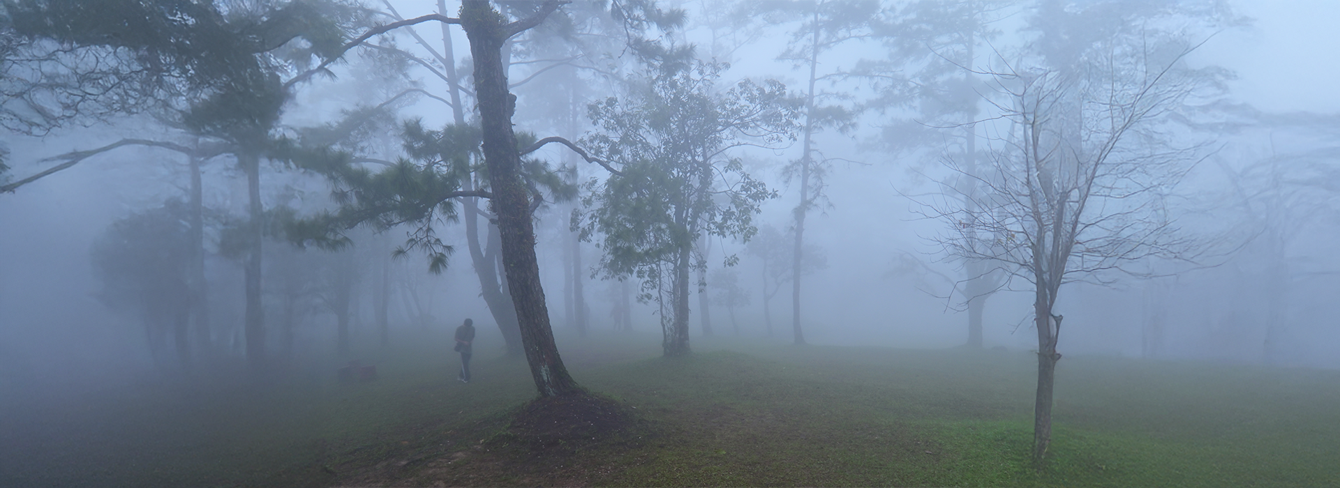 When the mist grows thick, everything disappears except the trees nearby, a quiet, surreal moment captured atop Phu Ruea at dawn.