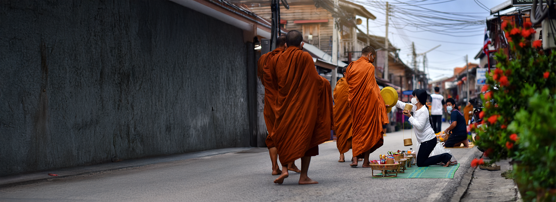 Monks Collecting Alms : Monks and novices walk gracefully along Walking Street, collecting alms in a morning ritual that has been part of Chiang Khan’s cultural fabric for generations.