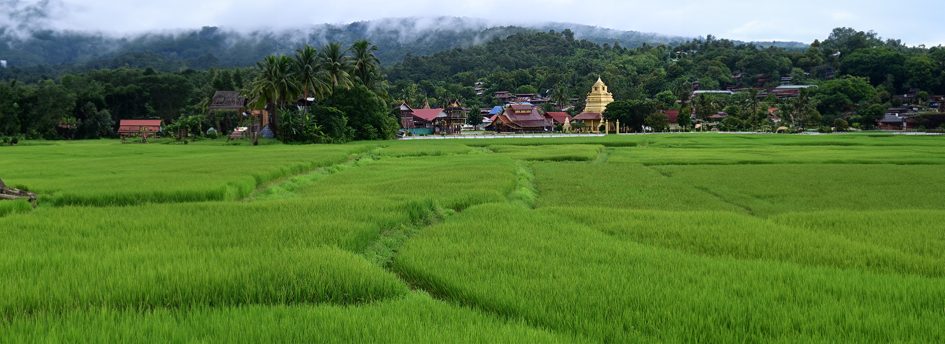 Misty Rice Fields: A view of misty rain over the rice fields of Ban Sang Pa, a common sight from the rainy season to early winter.