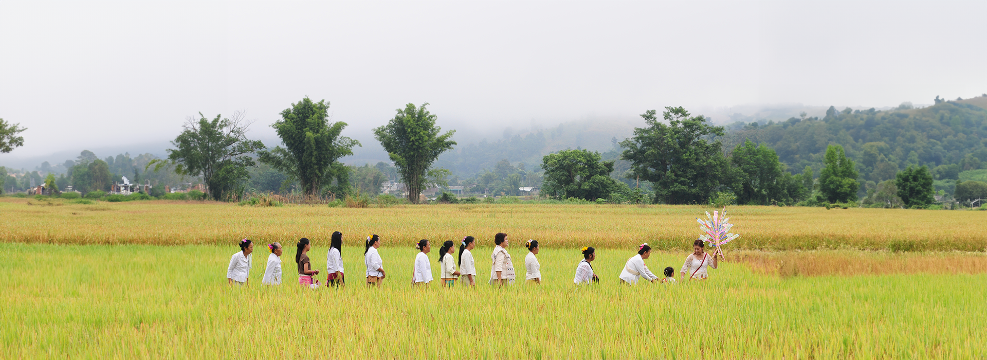 An image of Mae Chaem women with rice fields in the background, attending the temple during the Julakatthin ceremony, depicting the close relationship between the community and nature.