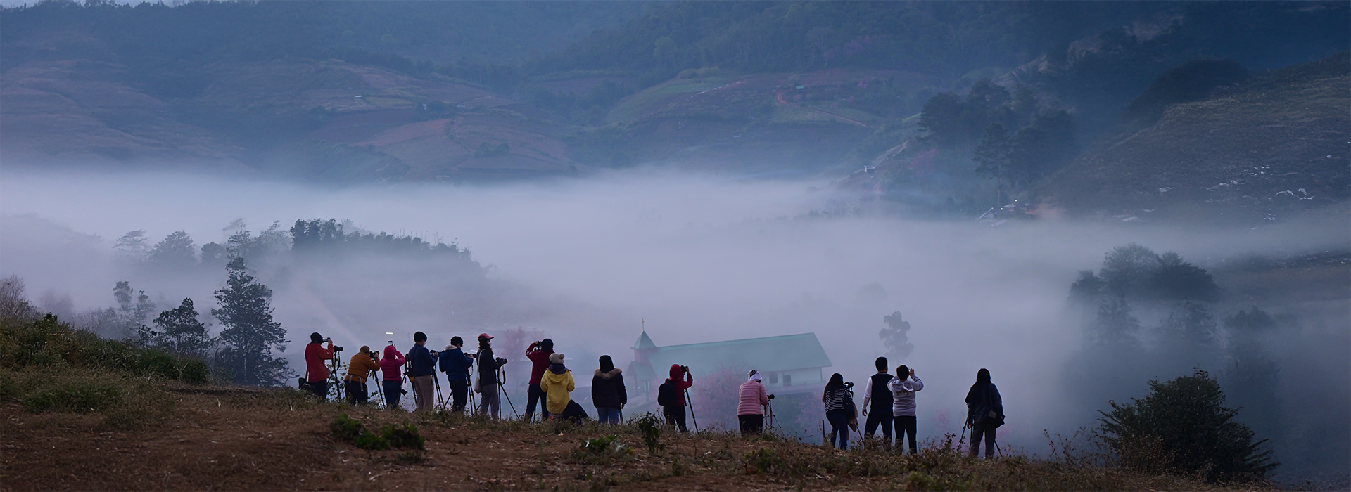Tourists in the Mist, Ban Mai Rong Kla : Visitors enjoy the mystical charm of morning mist at Ban Mai Rong Kla.