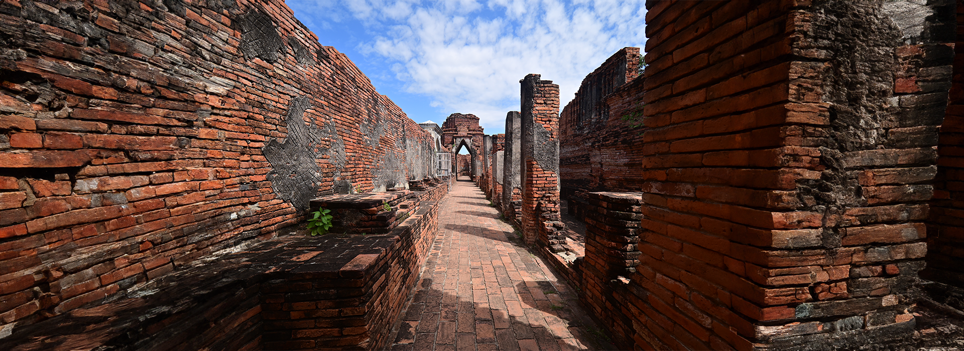 The first floor features a corridor lined with arched walkways, with pointed pavilions at intervals. These house Ayutthaya-style Buddha statues, adding a serene atmosphere to the ancient surroundings.