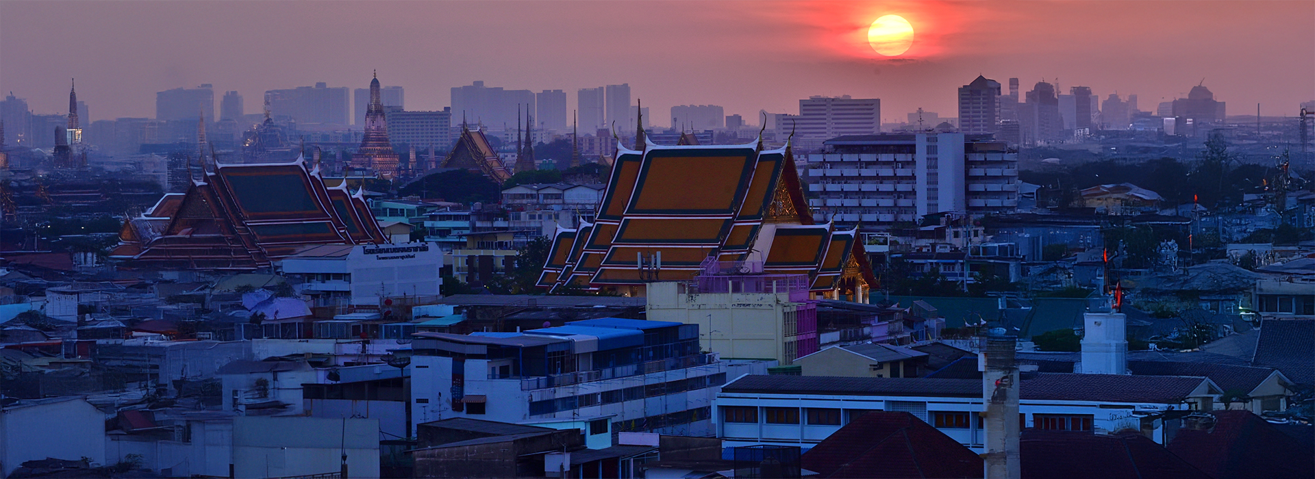 The Last Rays of Sunlight Over Bangkok, Seen from Wat Saket’s Golden Mount : As the sun sets, Bangkok’s skyline is bathed in a golden glow, offering a peaceful end to the day from the top of the Golden Mount.