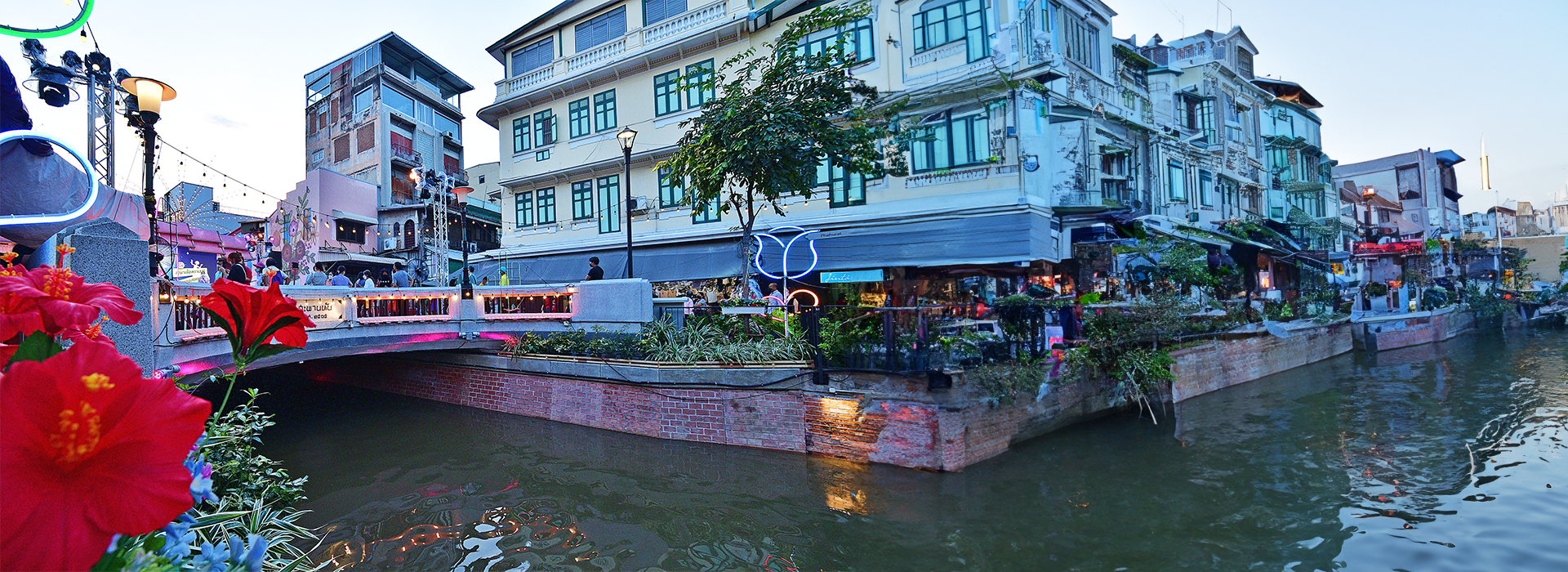 day, the banks of Khlong Ong Ang, stretching from across MRT Sam Yot station to Santiphap Park or the floating Sky Park of Chao Phraya, invite leisurely strolls along both sides of the canal. Convenient access to the Sky Park of Chao Phraya Bridge adds to the allure. Weekends witness a surge of tourists drawn to savor the sunset along the Chao Phraya River before indulging in shopping, dining, and exploring the banks of Khlong Ong Ang.